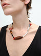 Materials: Handcrafted from natural ebony wood, amber and agate, with accents of cinnabar and smoky quartz. Features plateau red stone beads.